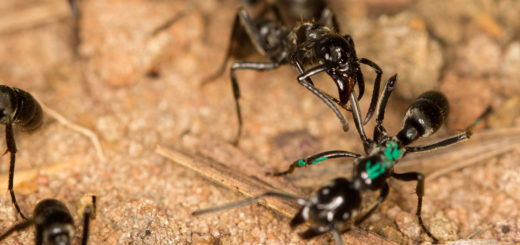 An ant’s fiercest competitor is often other ants. This is evident in the desert, where you can easily observe ant competing. For instance, I found these two workers, one Novomessor and one Pogonomyrmex, interacting aggressively at a nest entrance .