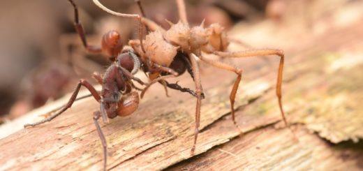 The best-known genus of trap-jaw ants, Odontomachus, are large ponerines. They forage with their mandibles open, ready to snap shut on an unlucky prey. The series of photos below showcases a forager encountering one of her sisters.