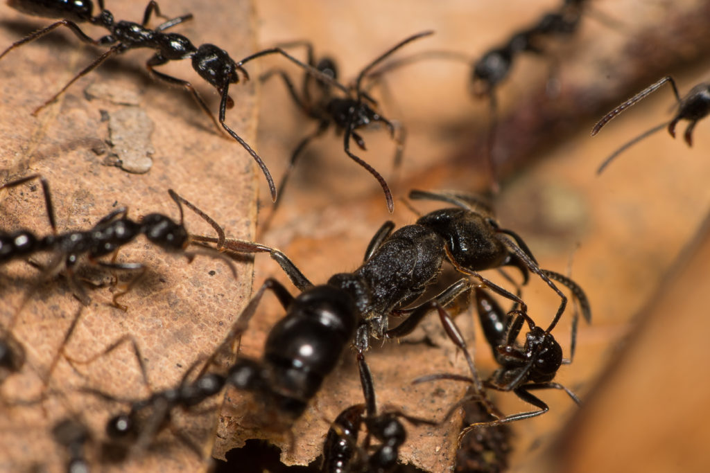 This large Camponotus mitis major was no match for its fire ant opponents. Despite slaying multiple assailants with its mandible, the fire ants finally overtook the C. mitis major with their sheer number.