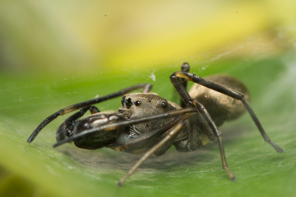 Mirror spiders (here a spider within the family Theridiidae) have plate-like structures that reflect light. The spider can even enlarge or shrink them in response to external stimuli. Seemingly fragile, the spider portrayed here nevertheless caught a spiny ant (Polyrhachis sp.), which has a though armor-like cuticle.