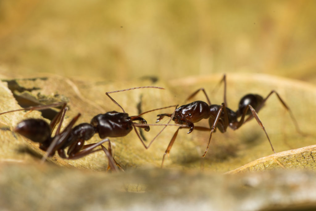 The genus Aenictus comprises more than 200 “army ant” species. They are so-called because of their propensity to hunt other ants. They also lead a nomadic lifestyle (i.e. their nests are bivouacs that move every few weeks). Runxi Wang and Roy Cheung these individuals among a large foraging trail.
