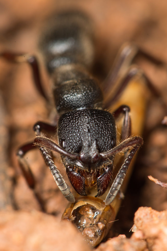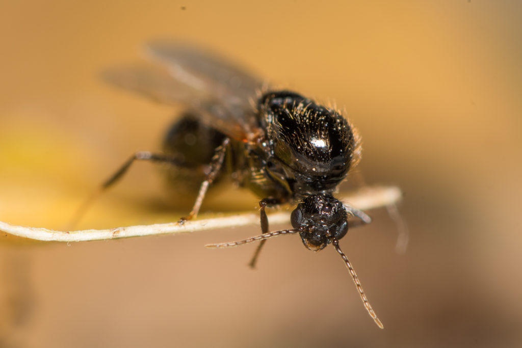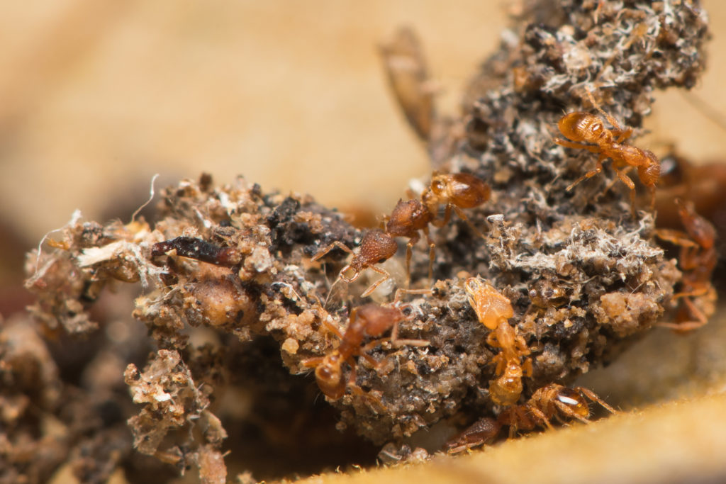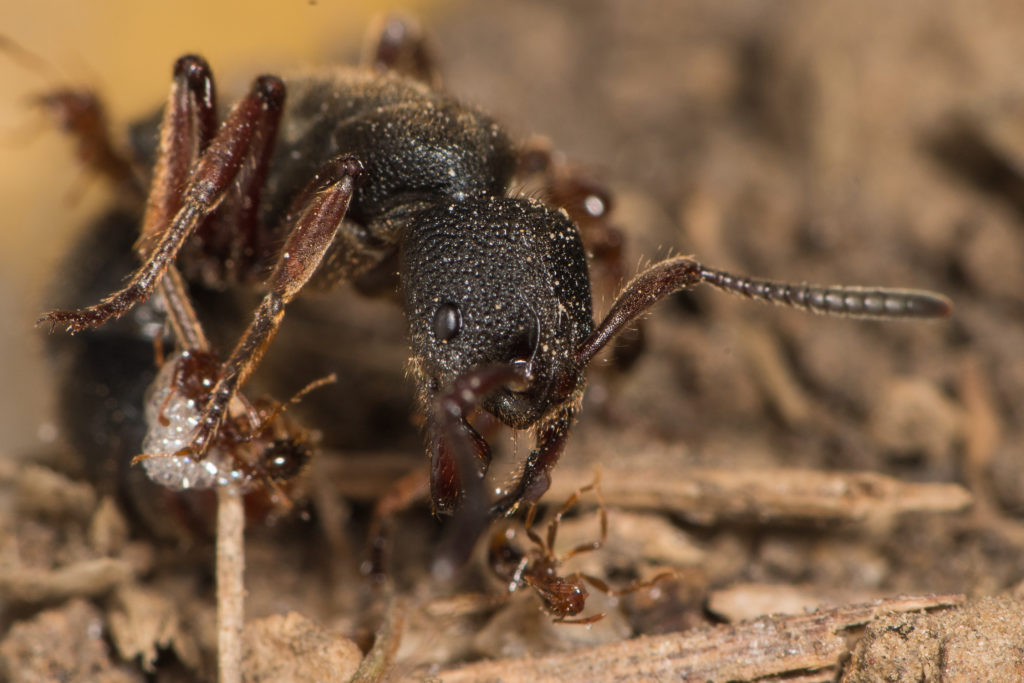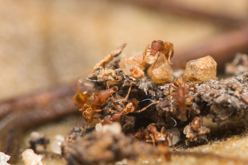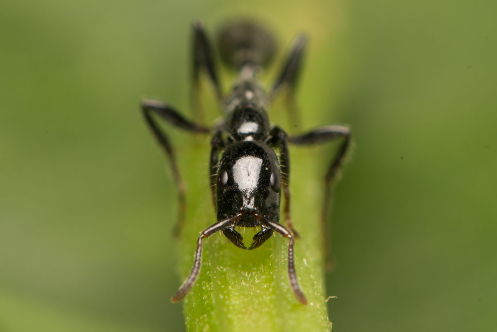 You can find hundreds of species of Strumigenys across the world’s tropical and subtropical areas. They are very common, as most samples of leaf litter seem to yield at least a few workers. However, they are rarely seen because of how minute and discreet they are. It was thus a pleasure to find a colony of S. minutula inside a nest left outdoors for a few weeks. If you look closely, you will notice the enlarged and square-shaped mesosoma of the queen.