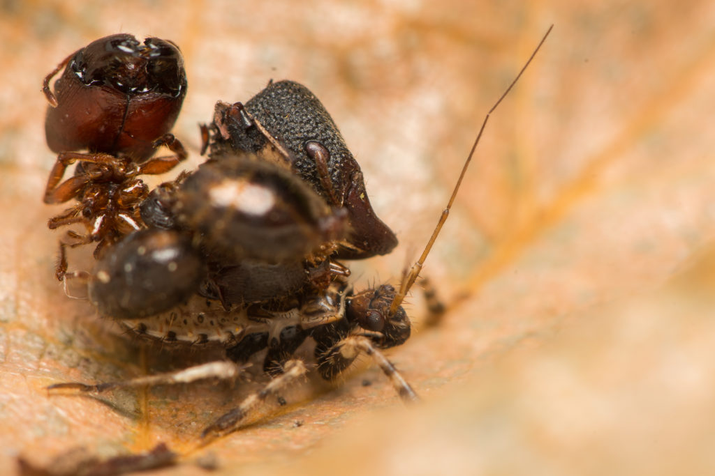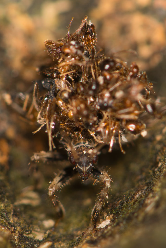 Assassin bugs (Reduviidae) are fierce predators that hunt their prey by using a piercing proboscis. However, they have their own predators, most notably jumping spiders (Salticidae). Some assassin bugs use ant carcasses to protect themselves against spiders. Since ants are notoriously hostile, by wearing ant remains assassin bugs not only appear larger but also more dangerous. The individual portrayed on the second picture had such massive ant carcasses on its back, most notably the head of a Pseudoneoponera, that it kept toppling over while walking.