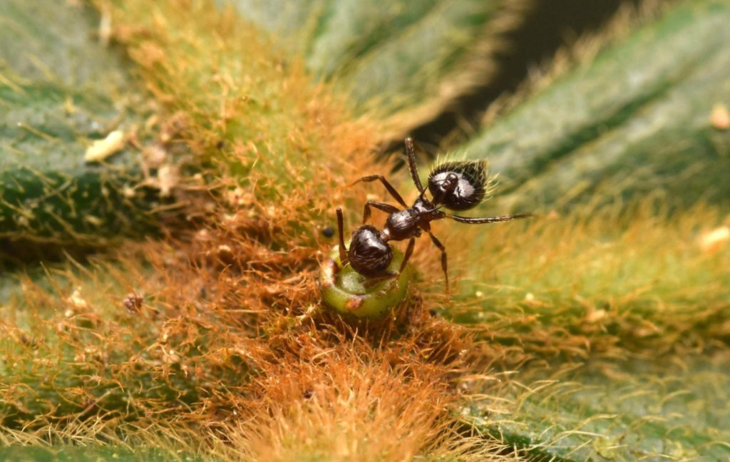 In another incident, we stumbled upon a Nesomyrmex nest in a low hanging twig. These little ants are really beautiful, having short spines and interesting cuticular patterns all over their body.