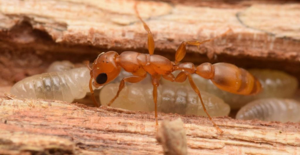 However, their coloration varies, and there are some colonies that have workers with more of a dirty brown than a red. In the picture below, one can see such a Camponotus leydigi worker taking care of a planthopper, which provides honeydew.