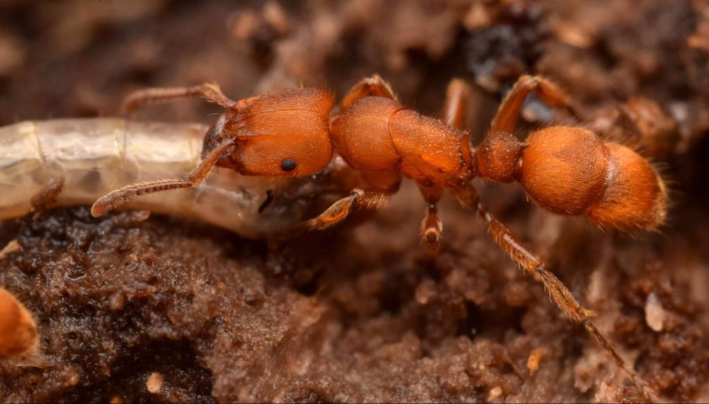 One of the very top of my bucket-list of “ants that I need to see” is the species-poor genus of Heteroponera, which are rather rare ants, but are most species-rich exactly in this southern part of Brazil. According to Felix, we would be able to find them in this forest. And indeed, after turning a big log on the forest floor, we were delighted to see a rather large orange worker of Heteroponera dolo, just waiting to be photographed. More workers came by, including some transporting a beetle larva as prey. We immediately came to the conclusion that their nest must be somewhere in that log, so we started to take it apart, piece by piece. And boy it was a great log! I do not even remember how many ant nests we have stumbled upon, but it was a lot. Unfortunately, there was no sign of the Heteroponera dolo nest. Then suddenly, we found a Heteroponera nest in that same log – but of a different species! It was Heteroponera mayri (thanks to Felix Rosumek &Rodrigo Feitosa for the ID).