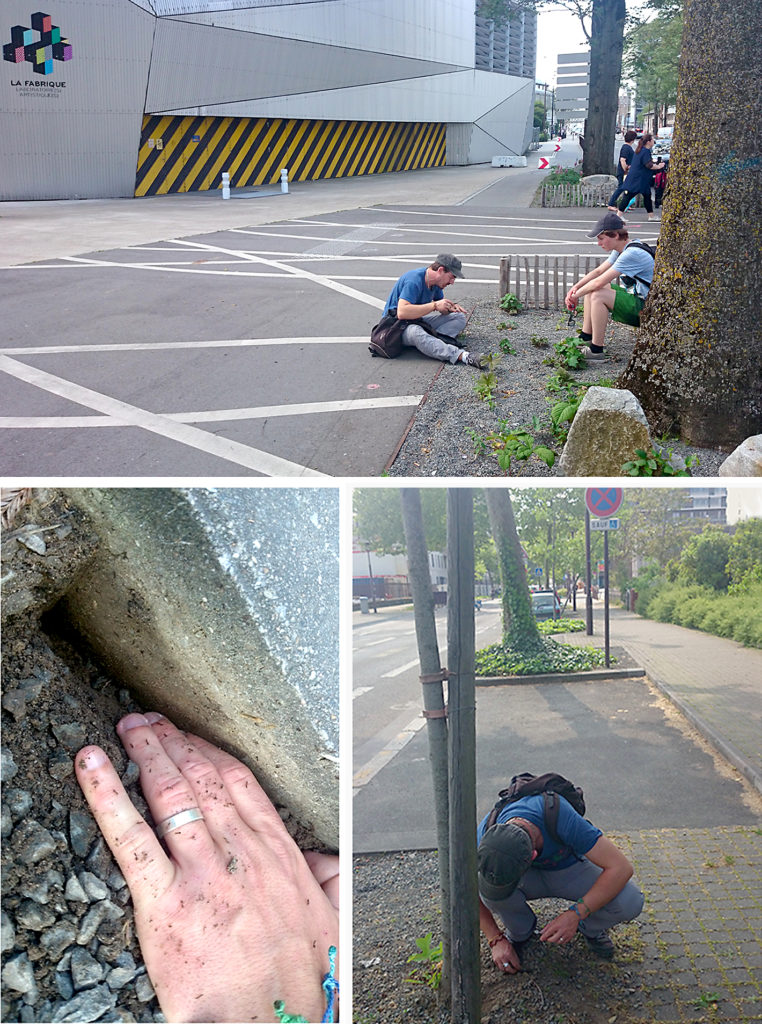 Picutres above: Measuring the Nantes colony in May 2018. Concentrations of workers (left bottom) were often found at the interface between soil and pavement and near trees (above and right bottom). The delicate task of sampling ants in urbanized areas: it makes you hate dogs… (above: J. Gippet (left) and M. Charrier (right)). (© N.P. Charrier)
