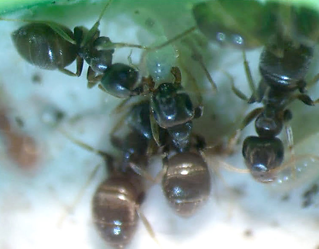 In a mixed colony, there is a full-fledged coexistence of workers of two species, with antennal contacts, following forage trails (possibly, along with the trail pheromones of L. fuliginosus). The very fact of the presence of L. umbratus workers on the trails outside the nest indicates a change in their lifestyle. Therefore, it can be assumed that the L. fuliginosus trail pheromones for L. umbratus will play a key role in movement outside the nest. Perhaps when the L. fuliginosus queen invaded the L. umbratus colony, the L. umbratus queen was able to survive or the L. umbratus queen was killed by the L. fuliginosus queen and the L. umbratus workers, which we see on the video, are just the remnants of the former queen.