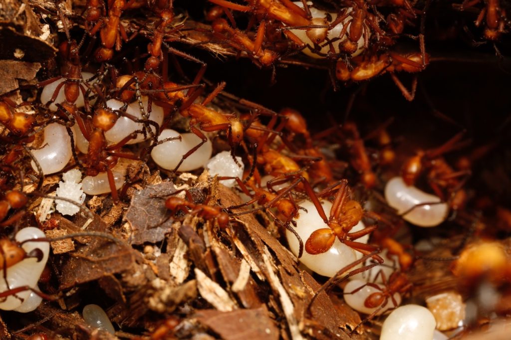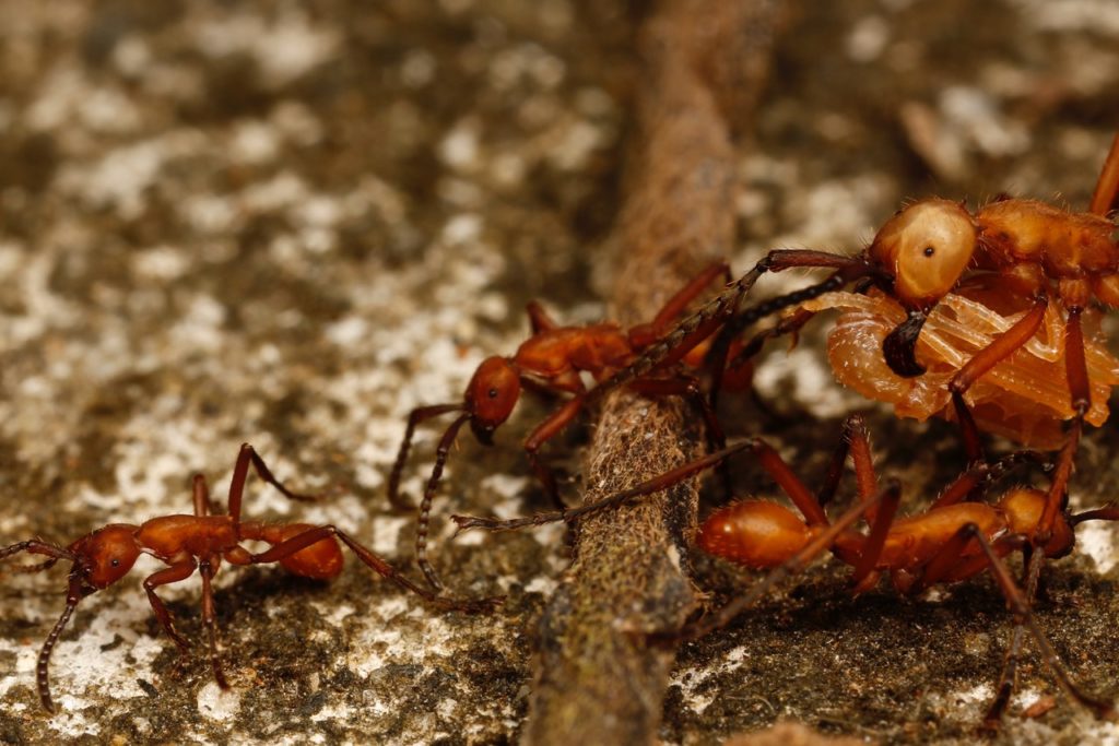 The next three chapters, mass raiding, nomadism, and colony fission, include fascinating stories and reasons to study army ants. Kronauer’s first-hand experience provides us with a window into the raiding swarm of Eciton as they pillage through the tropical forest, invading colonies of other ants and feasting on arthropods, without discriminating between walking, flying, or jumping animals. We learn how these raids are organised; that there are ‘pushing parties’ that initiate raids when trail pheromones are absent; ants that encounter gaps form living bridges for nestmates to walk to optimise traffic flow; and how information is transferred between nestmates. We learn the triggers for the development of such a bridge and when and why such bridges are abandoned. Most impressive is the vast array of prey captured by army ants which informs us of the extent of specialisation exhibited by each species. While the focus of the book is on two species of army ants, Eciton hamatum and Eciton burchellii, a reference to other army ants (Aenictus, Dorylus, Labidus, Neivamyrmex) or those that exhibit army-ant like behaviour (Leptogenys, Ooceraea) are made where possible. A distribution map of the army ants at the genus level would have revealed the extent of overlap, but this is accessible from the provided references (e.g., Borowiec 2016). A significant section is devoted to the art of building a bivouac, with clear information on the discrete nomadic and statuary phases, the factors that trigger these and what occurs during these phases. We are then treated to a relatively rare phenomenon, the formation of a new army ant colony, which involves splitting of an existing colony into two. This is riveting stuff – a non-fiction thriller!