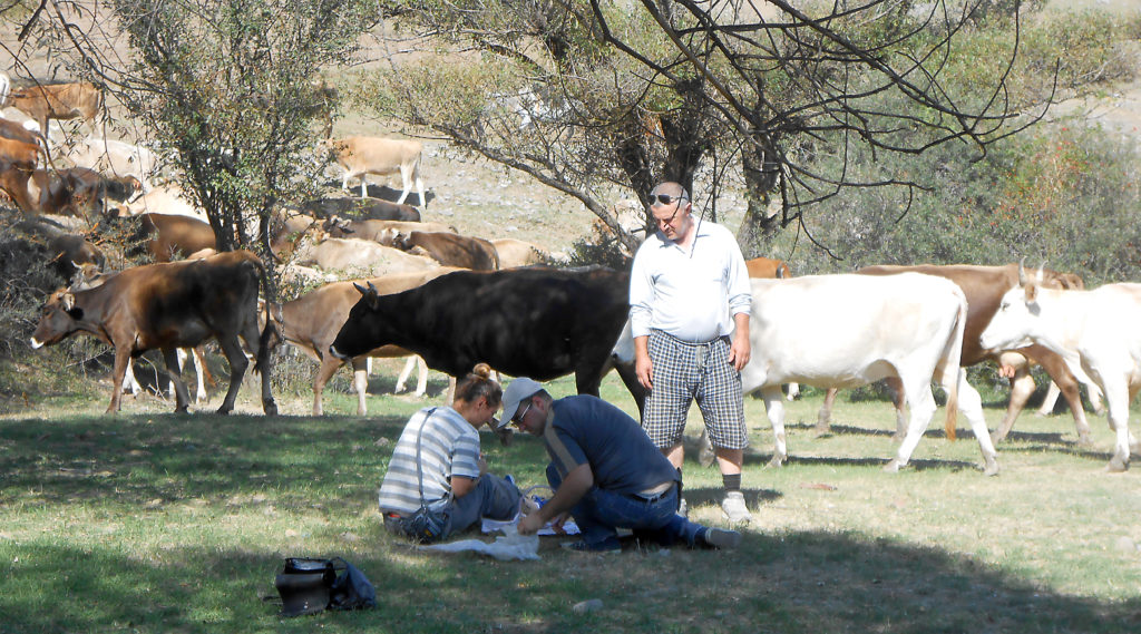 Field trip in Akhaltshikhe, Parekha , Georgia in 2013. Nana Gratiashvili and Shalva Barjadze are collecting Cardiocondyla ants. Our host Kako is looking at the collecting process with great interest. (©Juergen Heinze).