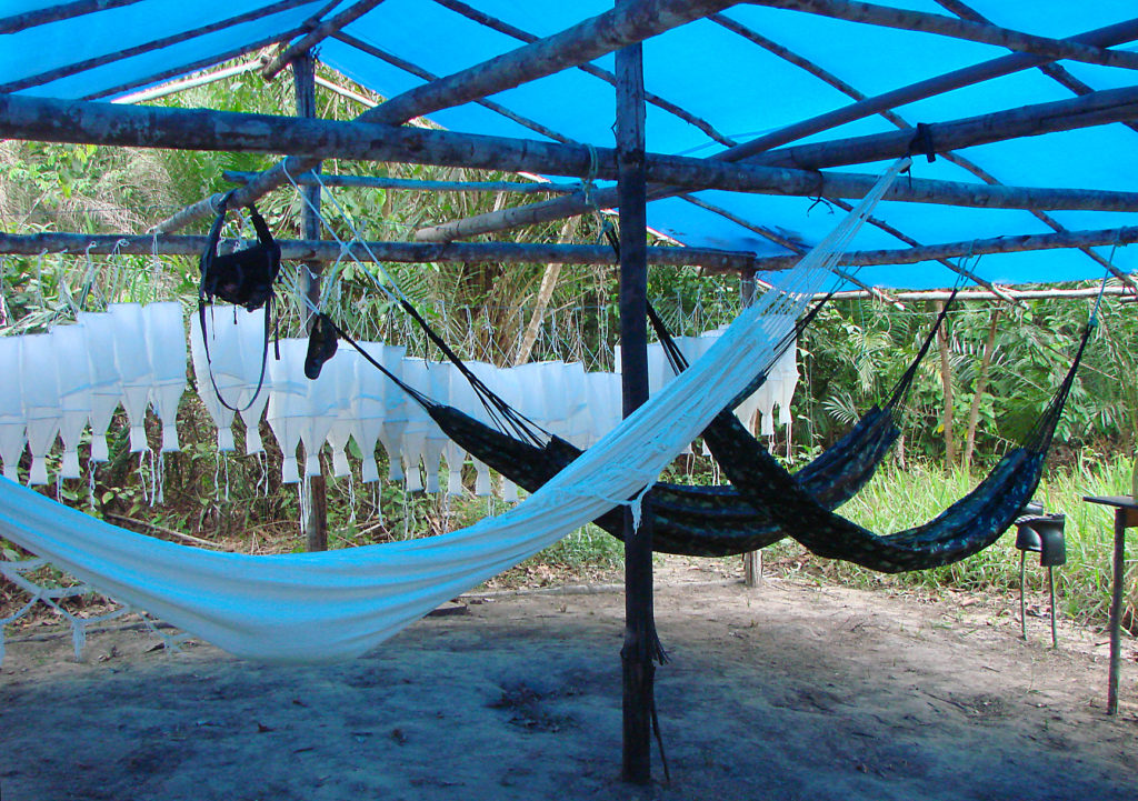 Hammocks installed in the camp at one of the studied sites (highway BR-319). In the background, there are Winkler extractors installed (© Alexandre Somavilla).