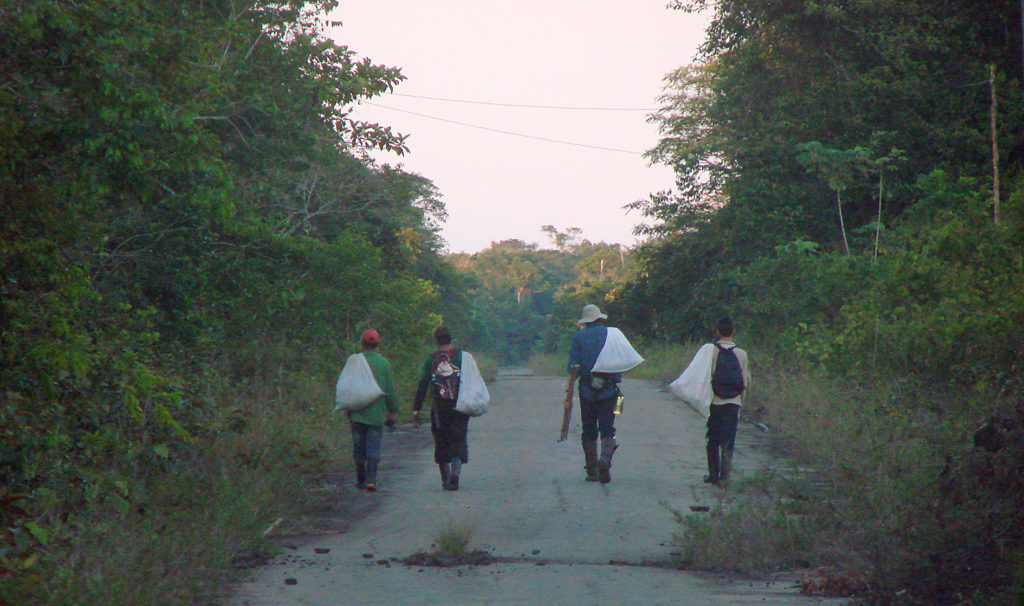 End of the collection day on the BR-319 highway. From left to right: Ayres Lopes (field assistant), Claudio Neto (Msc. Ants), Fabricio Baccaro (PhD. Ants) and Marcos Torres (Msc. Ants) (© Alexandre Somavilla).