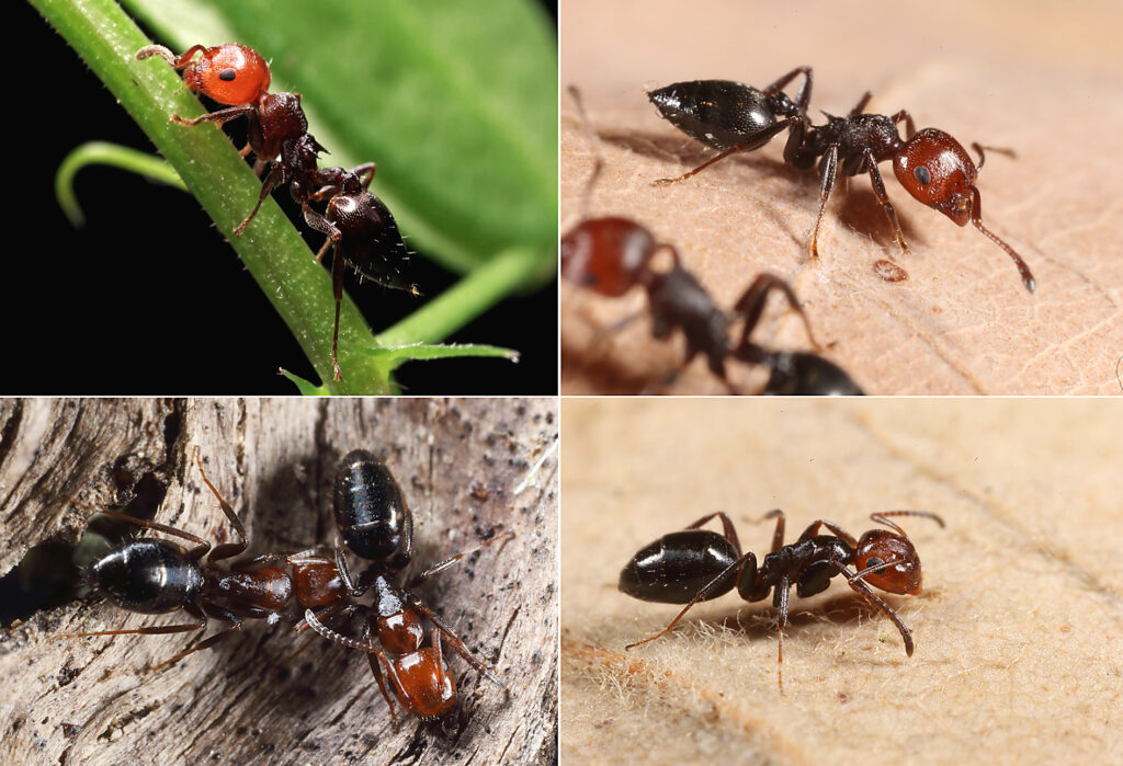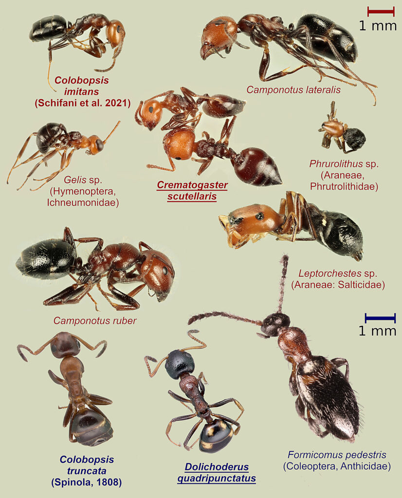 Picture below: Crematogaster scutellaris surrounded by a number of other arthropods with a similar chromatic pattern that were encountered in the proximity of its trails or nests in Sicily (names in red). Below, the same with Dolichoderus quadripunctatus in Northern Italy (names in blue). Note that it is not proven that all of these species are mimics. AntWeb specimens of Co. imitans and D. quadripunctatus photographed by Michele Esposito, other photos © Enrico Schifani.d with GIMP