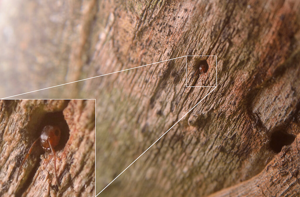 A general issue, especially at the start, was to collect or observe a sufficient amount of Co. imitans, especiallyin areas like in Citrus orchards or cork oak forests where we first found this species. We later discovered that galls like those of Andricus spp. in deciduous oaks may offer a good opportunity to find entire colonies since these ants may decide to use them as nests. However, in most other contexts, Co. imitans nests are impossible to access without harming the tree in which they are built. Moreover, their entrances are inconspicuous and difficult to find, and they often recycle a few of the many holes left by xylophagous insects as nests, so you don’t know which ones are occupied by ants unless you spot a worker or a soldier around. They tend to forage in very low numbers, so you may be able to see just very few workers from time to time, and if they sense a vibration because you inadvertently touched the tree they may all stop moving for quite a while. In addition, they do not leave their nest that often during a hot and dry summer or winter, and they may be very active only during relatively short periods of spring and autumn. It required some time and patience to learn about their activity patterns to adapt the sampling and observation.