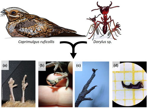 CC: The initial motivation came from a surprising field observation in 2015 of a nightjar with what appeared to be an ant mandible embedded in its toe. This unexpected find prompted us to look more systematically at foot injuries in nightjars, eventually leading to the discovery of a pattern linking these injuries to tropical army ants. However, it took me six long years to find a full head I could identify to solve the mystery!
