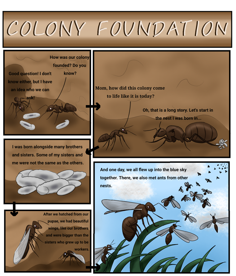 Marlene Anether has been fascinated with insects, and especially ants, ever since kindergarten. Now, after years of interacting with many species, she shares her extensive knowledge with others in the following comics. This fun, visual, and highly educational display will catch the eye of any ant and insect lover and can teach many of us some new facts about how ant societies are established.
