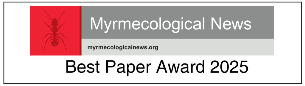 In 2026, Myrmecological News awards for the 8th time the Best Paper of the previous year. One paper of all contributions published in 2025 is selected based on a survey including the editorial board (weighted 50%) and the community (50%). The winner paper will be announced to the community, and its contact author will receive a certificate of this Best Paper Award 2025 and a voucher worth the Article Processing Charge (800 EUR) for a future contribution in Myrmecological News to be used within two years.