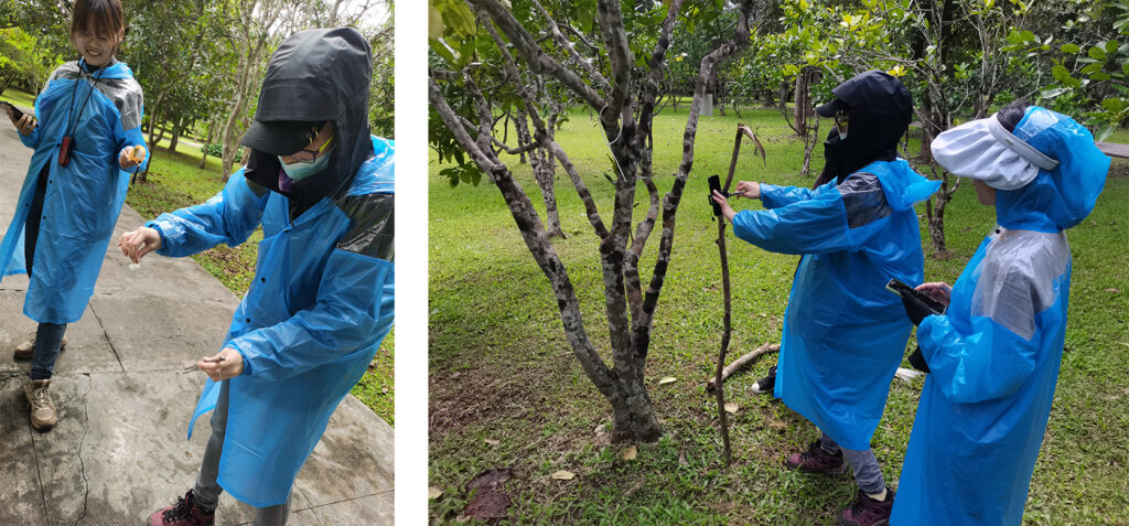 Fig. 3. Weaver ant workers aggressively defend their nests by spraying formic acid. During experiments, we wore raincoats to protect ourselves from potential skin burns. (© Vincent Okelo Wanga).