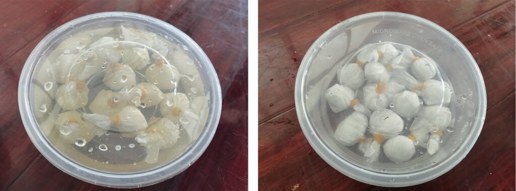 Fig. 2. Experimental setup for testing how added carbohydrates influence weaver ant behavior. Feeders consisted of cotton balls wrapped in gauze: (a) treatment feeders soaked in a saturated sucrose solution and (b) control feeders soaked in distilled water. (© Peiyun Li).