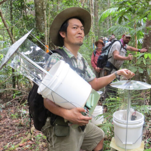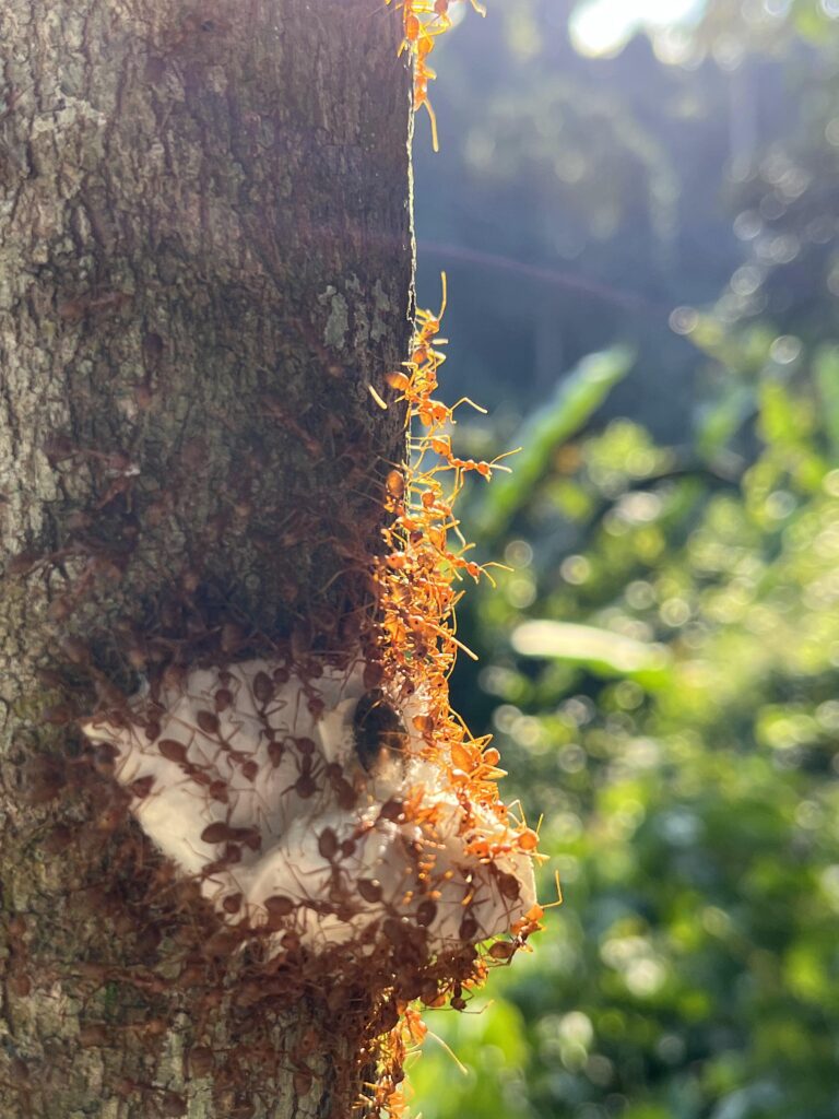 Fig. 1. Weaver ants (Oecophylla smaragdina) are renowned for their nest-building behavior, weaving leaves together in the canopy. Here, we search for colonies by looking for their characteristic leaf nests. (© Yidan Wang).